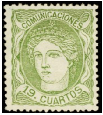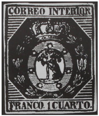 Further evidence for the authorship of the Spaniard comes from a curious stamp discovered in the British Isles. You cannot find it listed in any modern catalogue, not even in the catalogues of Cinderella stamps (Figure 14). It appeared for the first time in The Philatelic Journal within a conglomerate of stamps of different countries, without any indication of its origins (Ref. 14). Then it could be found again in the appendix of the Stanley Gibbons catalogue. We find it among other Spanish stamps, a fact that allows, apart from its inscription, its local identification, but it is not mentioned in the listing of the descriptive part of the catalogue (Ref. 15).