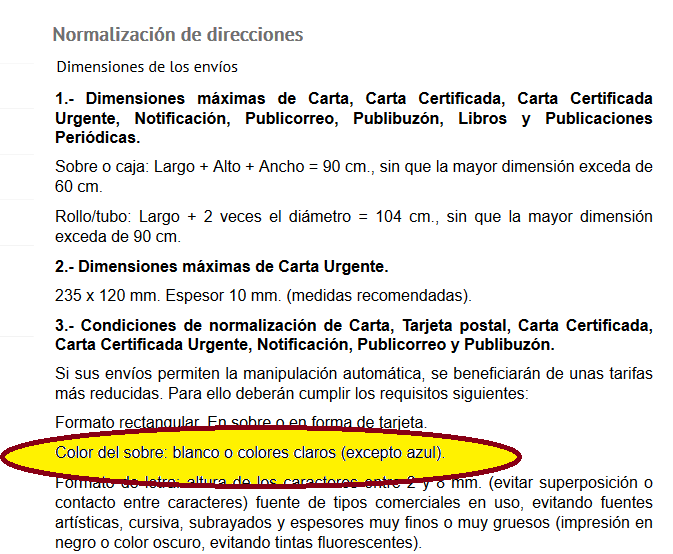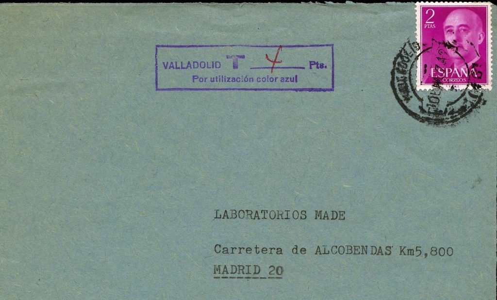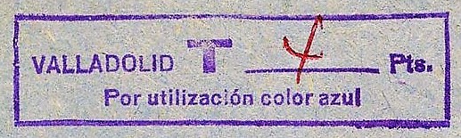 First of all, let’s see why this cover was taxed. We’ve previously said it was franked with a 2 Pts stamp, and according to 1974 postal rates2 it is correctly franked, as a 20 grs normalized letter had to bear a 2 Pts stamp3. So why was it taxed, then? The answer is in the tax mark, but when I first read it I hardly realized what the meaning of the text was. The mark reads “VALLADOLID T ___ Ptas. Por utilitzación color azul” (For using blue color, Fig. 2). Thanks to good friends4 always willing to share their knowledge I learned this mark explicitly refers to the color of the cover, not allowed according to the Spanish post rules. The usage of a blue cover automatically converts a 20 grs standard letter into a non standard letter, as if it had a bigger cover or a greater weight, and this increases the required franking to pay for the postal rate. For this example, the cover being blue despite having the same size and weight as a standard letter, the franking should have totaled 4 Pts, and as it is franked only with 2 Pts, the tax claims “the lacking double franking”, this is, 4 Pts. This rule, in use in 1974, is still valid (Fig. 3), though it is very seldom claimed.