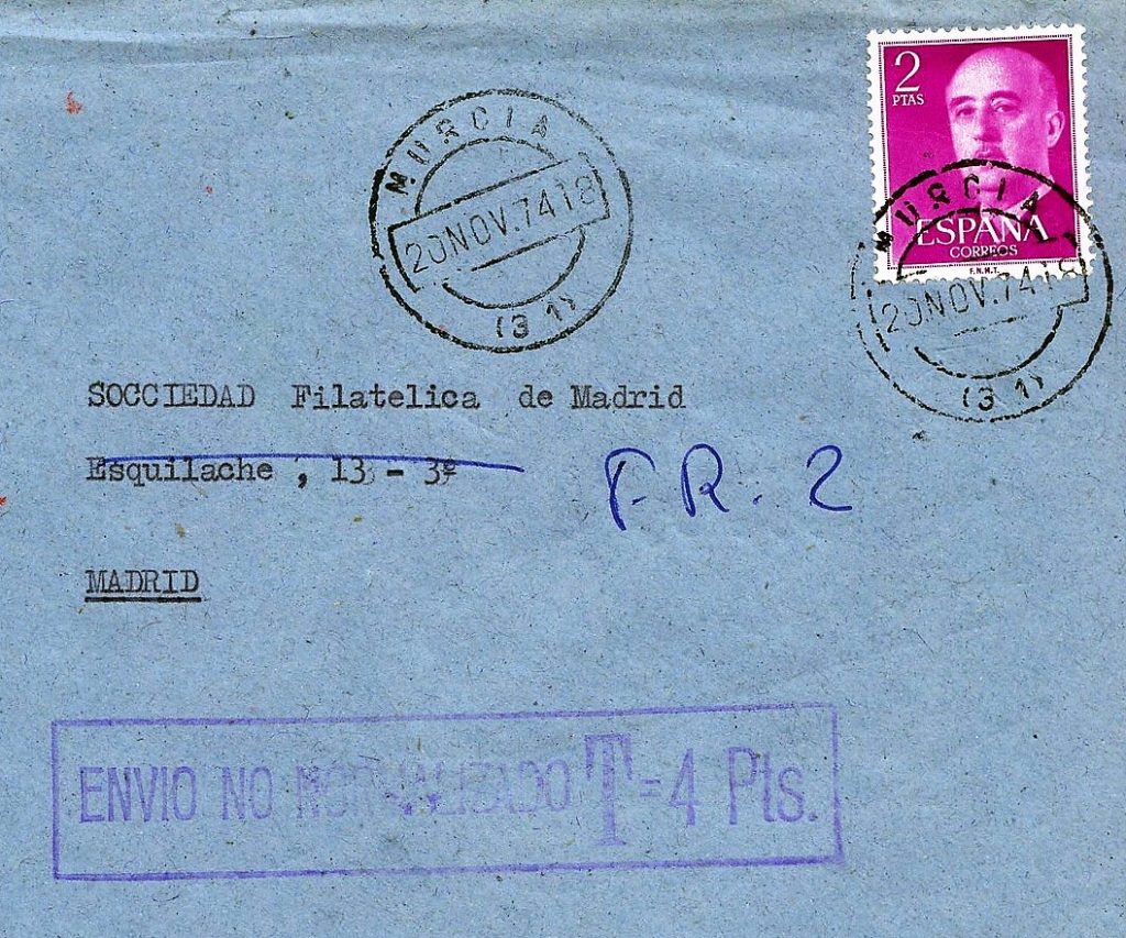 If we have a close look at the cover on Fig. 1 we don’t see anything special, it is a normal blue cover, sold in hundreds of office stores. It was circulated from Valladolid to Madrid, with a quite blurred postmark perhaps showing the date of January 10, 1974, franked with a basic Franco series 2 Pts stamp (Edifil 11581). It also has a tax mark. Nothing suspicious as far as we can see on this cover, but as a philatelist has a curious nature, we wanted to know more. So we did some research, and we asked some questions.