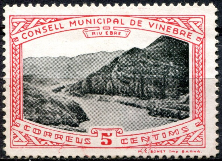 Very few times stamps of the Spanish civil war contain pictures in their designs, but this is what exactly happened with the first series of Vinebre locals (Allepuz 1-16). The set contains a central image depicting the Ebre river: