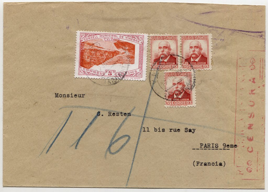 The piece I most love in my collection is no the rarest I have, but the first cover bearing a Vinebre inverted center stamp I purchased. The stamp is listed under Allepuz (number 4a), and the cover was addressed to the French dealer G. Resten, in 11 bis rue Say, Paris 9ème, France. It has a Vinebre postmark dated on July 12, 1937, a blue, hand written cross and registered mail number (116). It also bears a red censor mark from Barcelona Heller RB3.13, and there is a Paris arrival backstamp of July 15, 1937. There are only six covers in my collection with inverted centers with different colors or in se-tenant pairs.